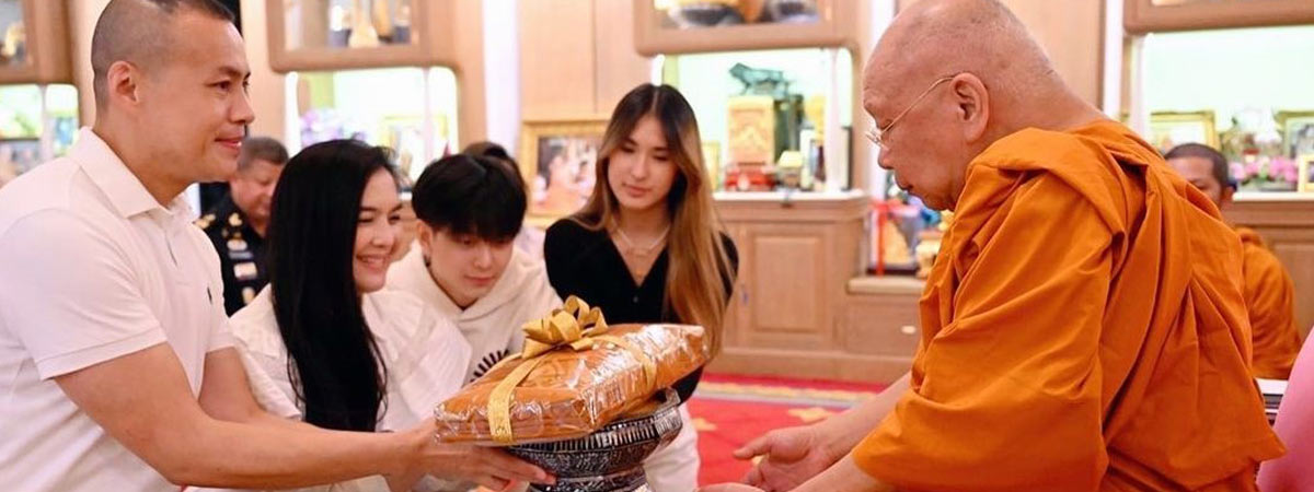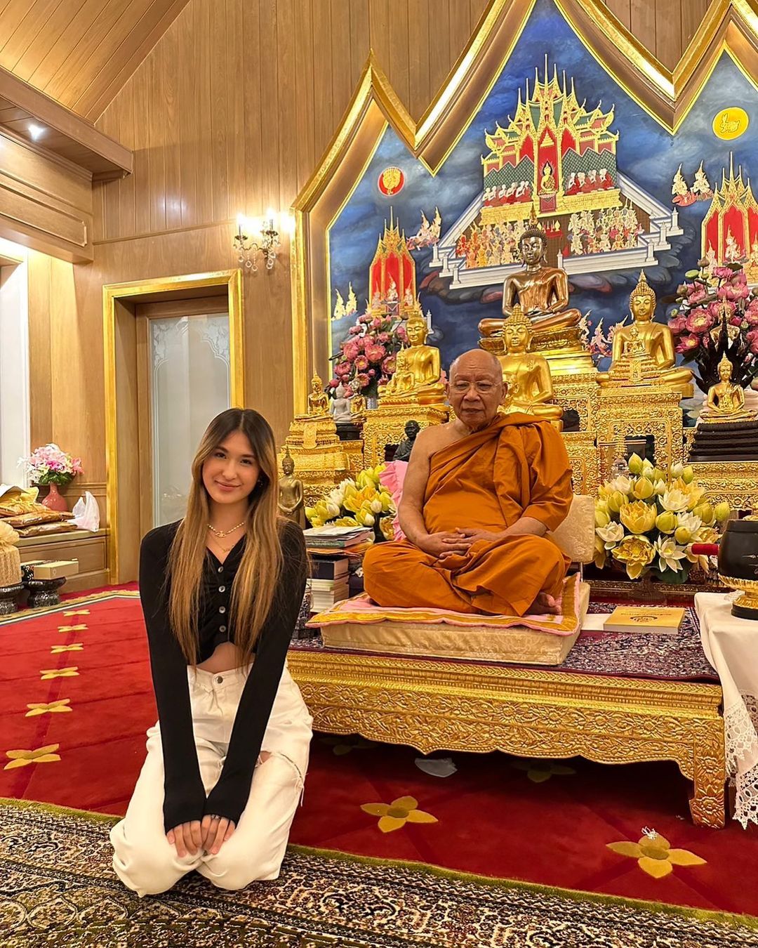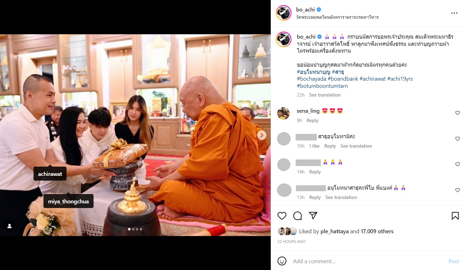 แม่โบมีการเขียนแคปชั่นด้วยว่า "กราบนมัสการขอพรเจ้าประคุณ สมเด็จพระมหาธีราจารย์ เจ้าอาวาสวัดโพธิ์ พาลูกมาฟังเทศน์ฟังธรรม และทำบุญถวายผ้าไตรพร้อมเครื่องสังฆทาน ขอน้อมนำบุญกุศลมาฝากกัลยาณมิตรทุกคนด้วยค่ะ"
