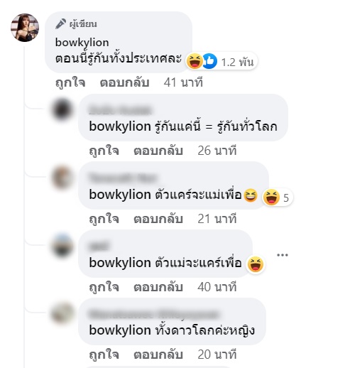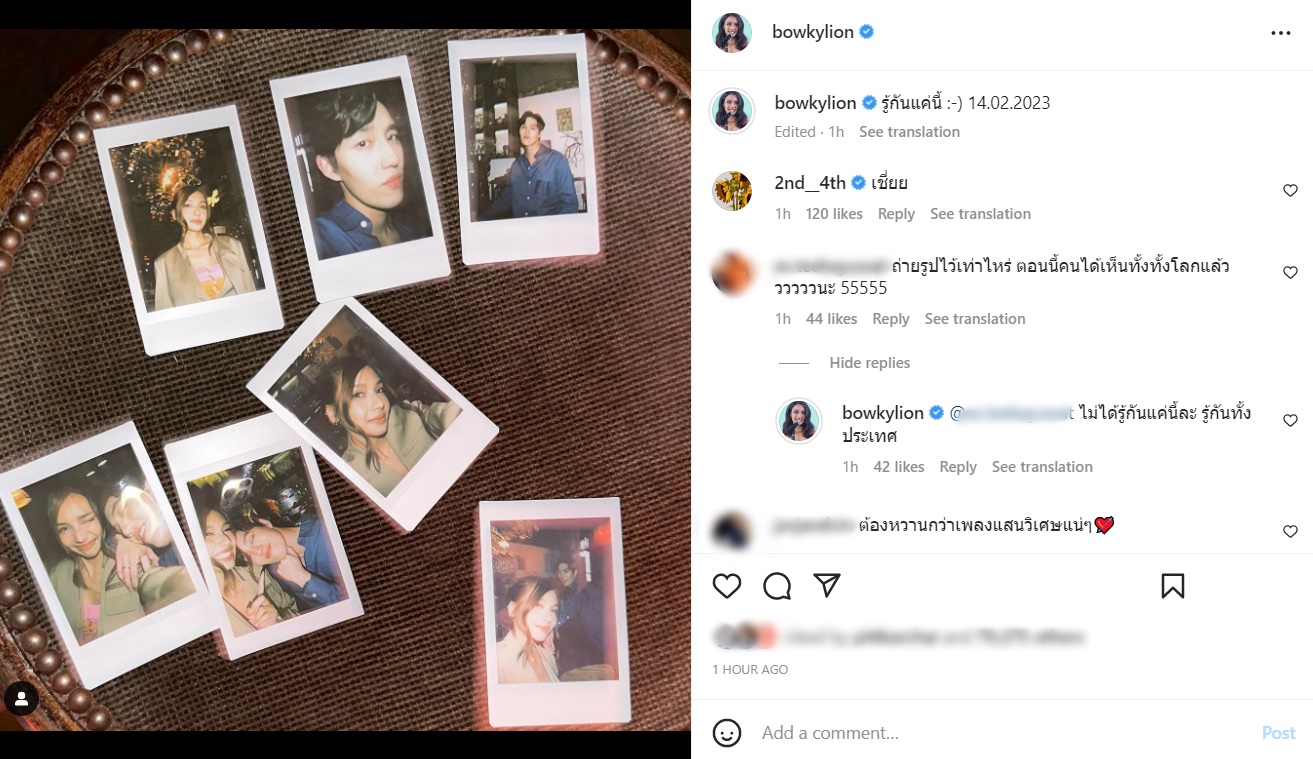 งานนี้เลยมีคนเข้ามาคอมเมนต์กรี๊ดกร๊าดกันรัว ๆ ใน IG และเฟซบุ๊กของ โบกี้ไลอ้อน ว่าอะไรยังไง มีความหวาน เห็นแล้วอิจฉามาก บ้างก็บอกว่าอกหักแล้ว ยังไม่ถึงวันวาเลนไทน์เลย ทำไมโชว์สวีตเบอร์นี้ แถมเจ้าตัวยังขยี้ในคอมเมนต์อีกว่า "ตอนนี้รู้กันทั้งประเทศละ"
