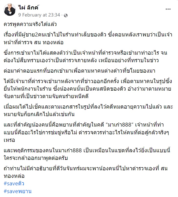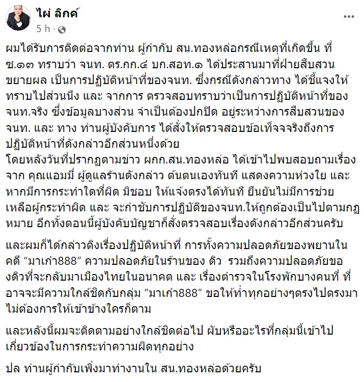หลังจากนั้น ไผ่ ลิกค์ ยังโพสต์เพิ่มเติมถึงเรื่องนี้ว่า จากที่ตนโพสต์ถึงการตรวจค้นร้านทำเล็บดิวออกไป ทาง ผกก.สน.ทองหล่อ ที่เพิ่งมารับตำแหน่ง ก็ติดต่อมาบอกว่า เป็นการปฏิบัติหน้าที่จริง แต่ข้อมูลบางส่วนต้องปกปิด ในวันนั้น มีการเข้าไปสอบถามผู้ดูแลร้านด้วยความห่วงใย พร้อมกำชับว่า ถ้าหากมีการกระทำใดที่ผิดและมิชอบ ให้แจ้งโดยตรง ตำรวจจะไม่มีการช่วยเหลือผู้กระทำผิด และจะปฏิบัติเรื่องนี้ให้เป็นไปตามกฎหมาย