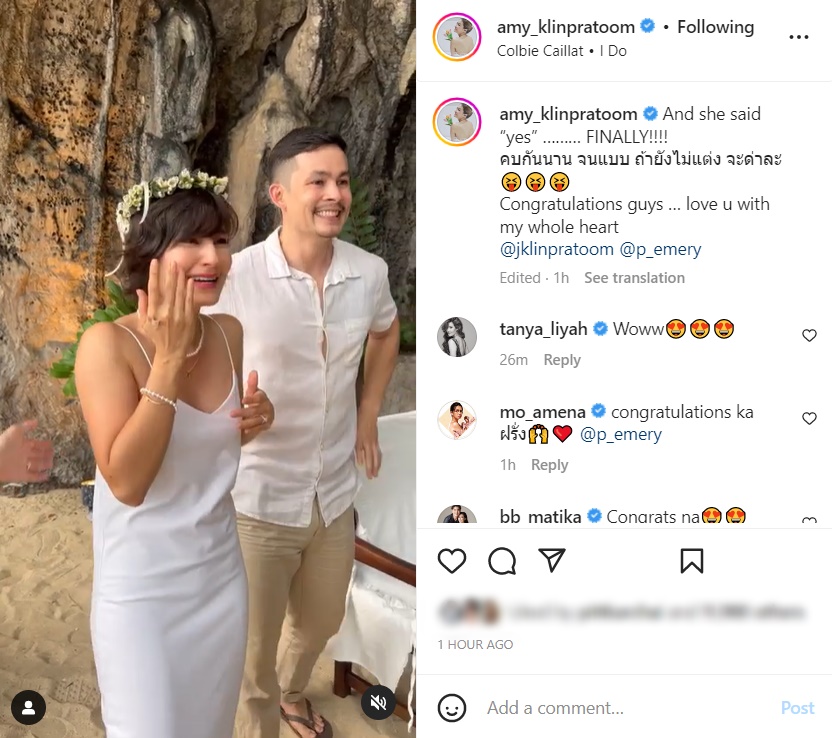 ทั้งนี้สาว เอมี่ กลิ่นประทุม ก็ได้โพสต์คลิปพร้อมข้อความยินดีกับ เจเจ น้องชาย และว่าที่น้องสะใภ้ แพร เอมเมอรี่ ระบุว่า "And she said "yes" ……… FINALLY !!!! คบกันนาน จนแบบ ถ้ายังไม่แต่ง จะด่าละ Congratulations guys … love u with my whole heart @jklinpratoom @p_emery"
