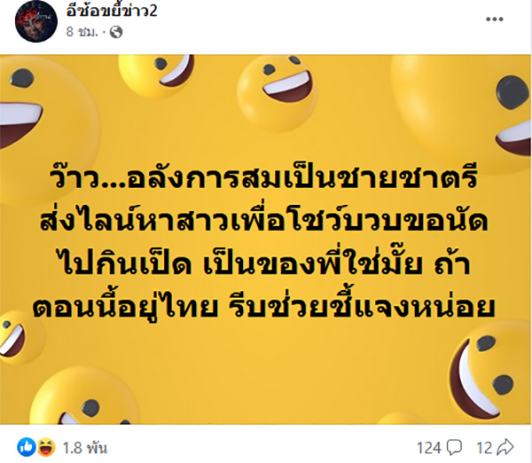 และอีกโพสต์เผยว่า "ว้าว...อลังการสมเป็นชายชาตรี ส่งไลน์หาสาวเพื่อโชว์บวบขอนัดไปกินเป็ด เป็นของพี่ใช่มั๊ย ถ้าตอนนี้อยู่ไทย รีบช่วยชี้แจงหน่อย"