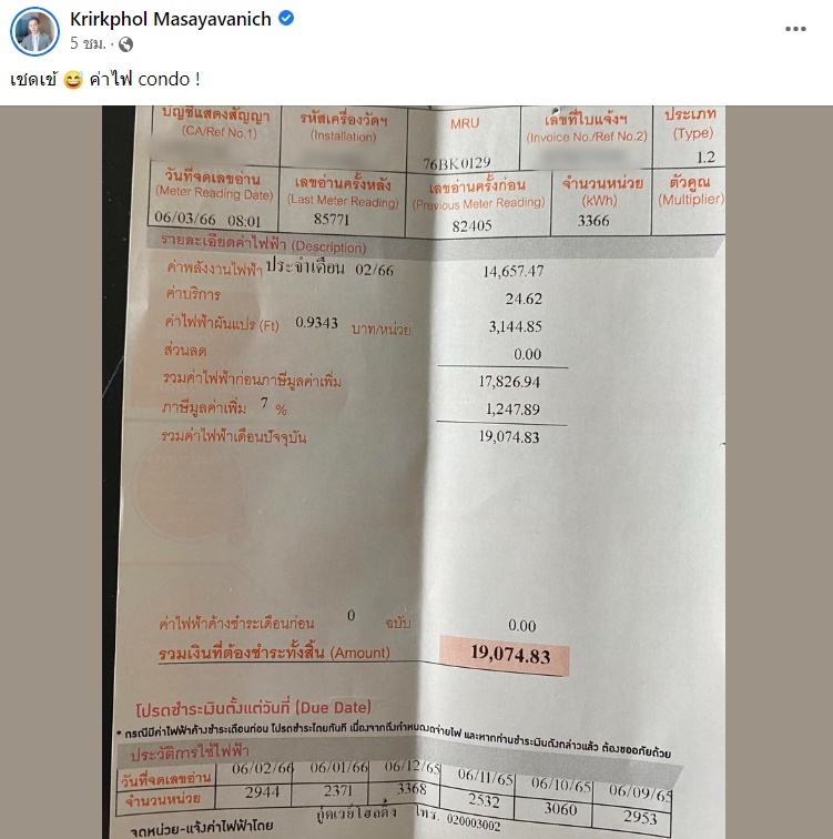 เช่นเดียวกับ ฟลุค เกริกพล ที่ล่าสุด (11 มีนาคม 2566) ได้โพสต์โชว์บิลค่าไฟเดือนล่าสุดที่คอนโดของตนเอง ซึ่งมีการใช้ไฟมากกว่า 3 พันหน่วย และราคาค่าไฟรวมกว่า 1.9 หมื่นบาท พร้อมแคปชั่นแทนใจว่า "เชดเข้ ค่าไฟ condo !"