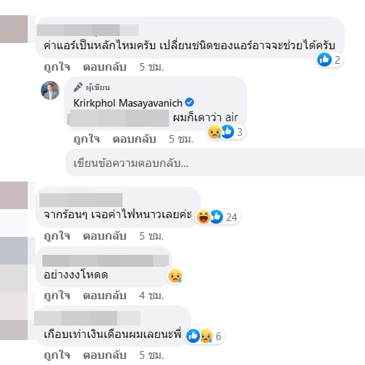 งานนี้ก็มีหลายคนเข้ามาคอมเมนต์ บอกว่าค่าไฟโหดมาก จากร้อน ๆ เจอค่าไฟแล้วหนาวเลย บ้างก็คาดว่าที่ค่าไฟแพงอาจจะเป็นเพราะแอร์หรือเปล่า ซึ่งทาง ฟลุค เกริกพล ก็ตอบกลับว่า "ผมก็เดาว่า air" อย่างเห็นด้วยกับคอมเมนต์ดังกล่าว