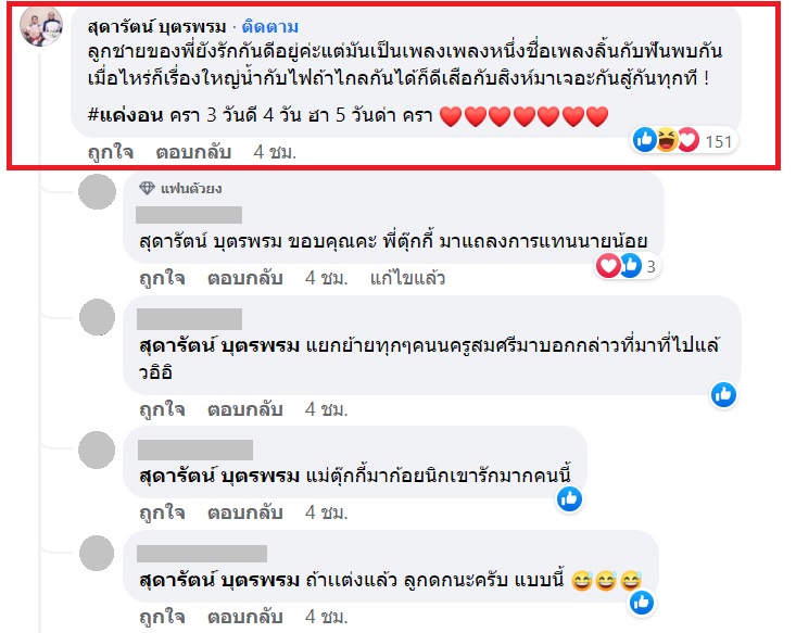 ล่าสุด (11 มีนาคม 2566) ไม่ปล่อยให้ขาเมาท์ต้องรอนานข้ามคืนจนขอบตาดำ เพราะนักแสดงตลกรุ่นพี่อย่าง ตุ๊กกี้ สุดารัตน์ เข้ามาคอมเมนต์คอนเฟิร์มแล้วว่า นิกกี้และก้อยยังรักกันดี แค่งอนกันเฉย ๆ โดยตุ๊กกี้เผยว่า "ลูกชายของพี่ยังรักกันดีอยู่ค่ะ แต่มันเป็นเพลงเพลงหนึ่ง ชื่อเพลง ลิ้นกับฟันพบกันเมื่อไรก็เรื่องใหญ่ น้ำกับไฟถ้าไกลกันได้ก็ดี เสือกับสิงห์มาเจอะกันสู้กันทุกที ! แค่งอนค่า 3 วันดี 4 วันฮา 5 วันด่าค่า"
