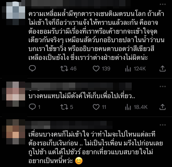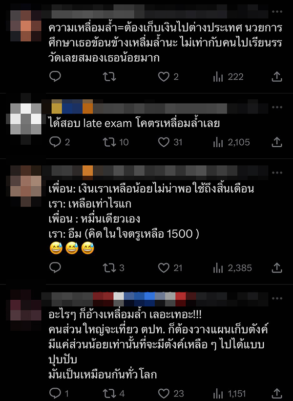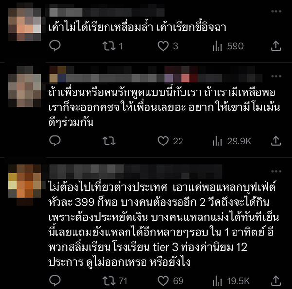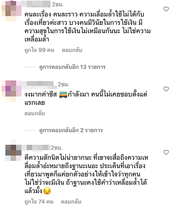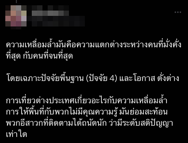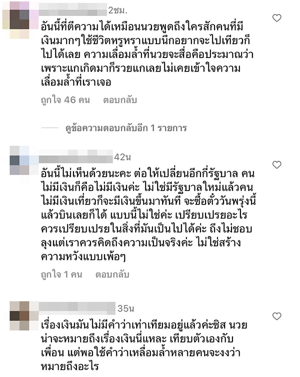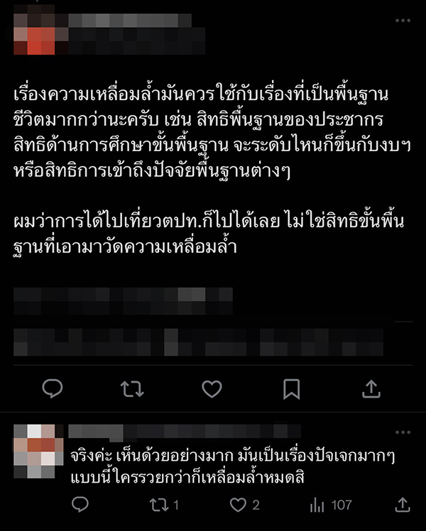 ส่วนอีกด้าน มองว่า ตรรกะบ้ง มันเกี่ยวกันตรงไหน คนละเรื่องกันหรือเปล่า การไปเที่ยวต่างประเทศ ไม่ใช่แค่คนไทย แต่พวกฝรั่งหรือคนชาติอื่น ๆ ทั่วไป การไปเที่ยวก็ต้องมีการวางแผนการเก็บงินเดินทางทั้งนั้น อย่าเอาฐานะ สภาวะการเงินมาบอกเป็นความเหลื่อมล้ำเลย มันไม่ได้ เพราะต่อให้เศรษฐกิจดี รัฐบาลเริด พื้นฐานการใช้ชีวิตหรือพื้นฐานทางการเงินของแต่ละคนก็ไม่เท่ากันอยู่ดี มันไม่มีความเท่าเทียมในเรื่องแบบนี้อยู่แล้ว