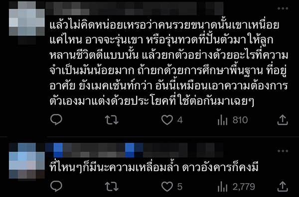 ชาวเน็ตเข้ามาคอมเมนต์สนั่น หลากหลายมุมมอง ทั้งเข้าใจประเด็นที่มิลลิต้องการจะสื่อออกมา เปรียบเปรยให้เห็นภาพและเข้าใจง่าย ถึงฐานะทางการเงินของแต่ละคน โดยยกเรื่องเที่ยวมาพูด ให้เข้าใจว่าคนรวย มีอิสระทางการเงิน อยากไปไหนทำอะไรทำได้ทันทีไม่ต้องคิด ส่วนคนที่ฐานะด้อยกว่า การจะเที่ยวก็ต้องเก็บเงินก่อนและวางแผนการเที่ยว เพราะฉะนั้น คนที่เกิดมารวยเลยไม่เคยเข้าใจความเลื่อมล้ำที่อีกคนเจอ