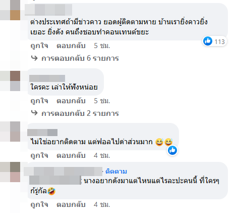 อาทิ คนชอบเผือกเยอะ, ที่ฟอลเข้าไปคือไปเผือก 90% ที่ติดตามอยู่แล้ว 10%, นางอยากดังแหละ ดูก็รู้ไม่สนดราม่าด้วย, ต่างประเทศถ้ามีข่าวคาว ยอดผู้ติดตามหาย บ้านเรายิ่งคาวยิ่งเยอะ ยิ่งดัง คนถึงชอบทำคอนเทนต์ขยะ, ไม่ใช่อยากติดตาม แต่ฟอลฯ ไปด่าส่วนมาก, สังคมไทยชอบสนับสนุนอะไรแบบนี้ เห็นที่ดัง ๆ ก็แบบนี้ทั้งนั้น, นางมีเสน่ห์นะ คนชอบเยอะ, ก็คนไทยอะเนอะ ชอบอะไรแบบนี้อยู่ละ ไม่ว่าจะ เน็ตไอดอล ทั้งหลายแหล่ ทั้งโจร ทั้งผู้กระทำผิด ต่าง ๆ ไทยแลนด์แดนดราม่า 555+, ฯลฯ