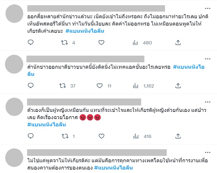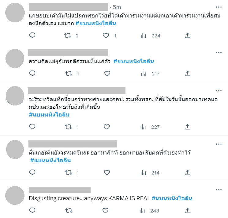 - ชาวเน็ตจี้ให้ หนิง ไอลีน รวมถึงพิธีกรรายการทั้งสองคน ออกมาชี้แจง ไม่อยากให้เงียบแล้วปล่อยเบลอแบบนี้ ควรให้เกียรติเพื่อนร่วมงานและบุคคลที่กล่าวถึง ไม่ว่าจะเป็นเพศไหนก็แล้วแต่