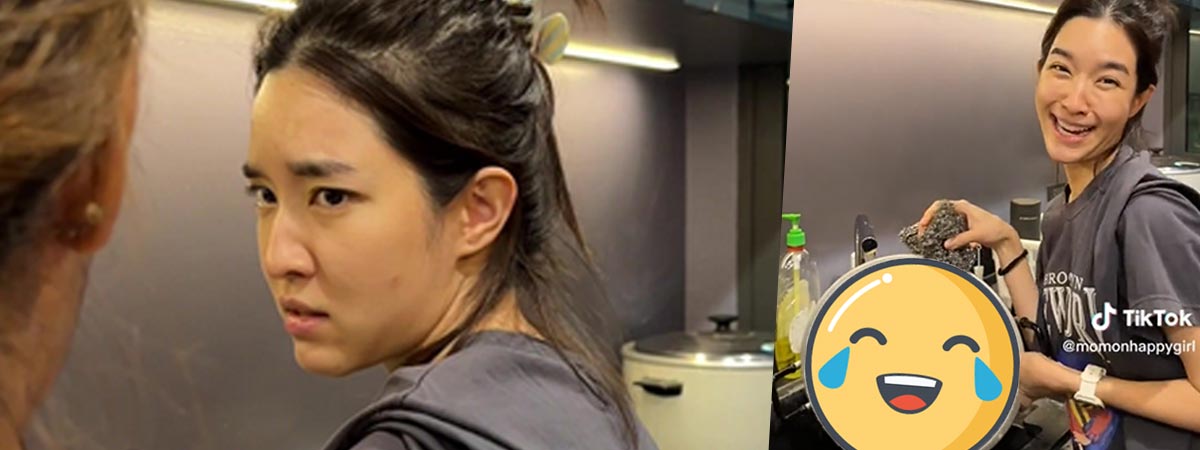 ก่อนจะปรับสีหน้าเป็นยิ้มแย้มทันทีและบอกว่า "แต่ชอบล้างกระทะมากกว่านะคะ" พร้อมโชว์สกิลขัดหมูกระทะแบบรัว ๆ จนเศษอาหารหลุดเกลี้ยง และยังลงแคปชั่นไว้ด้วยว่า "โมไม่ชอบล้างจาน #โมมนชนก, #เหวี่ยง"
