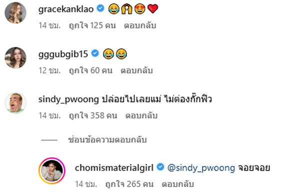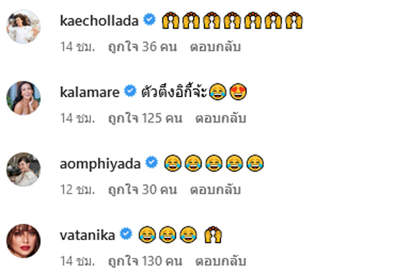 งานนี้เล่นเอาเพื่อน ๆ ดาราและแฟนคลับเข้ามาคอมเมนต์ชมกันสนั่น พร้อมบอกว่าใครจะเป็นอีกี้ก็เป็นไป เพราะแม่ชมเขามาเหนือเป็น แม่อีกี้ ไปแล้ว อาทิ แต่ถูกทุกตรงนะคะ, ยังรอด, ตัวตึงอีกี้จ้ะ, แม่ก็อินเทรนด์, สวัสดีค่ากี้ 55555, หน้าเดิมค่ะ, แม่ชมสวยจังค่ะ, ตัวมัมอีกี้มาแล้ว 555555, 90 มากค่ะแม่, แม่อีกี้ จบ ฯลฯ โดยมี ปิงปอง ธงชัย ๆ ได้เข้ามาคอมเมนต์ว่า "ปล่อยไปเลยแม่ ไม่ต่องกั๊กฟิล" ซึ่งสาวชมพู่ก็ตอบกลับไปว่า "จอยจอย"