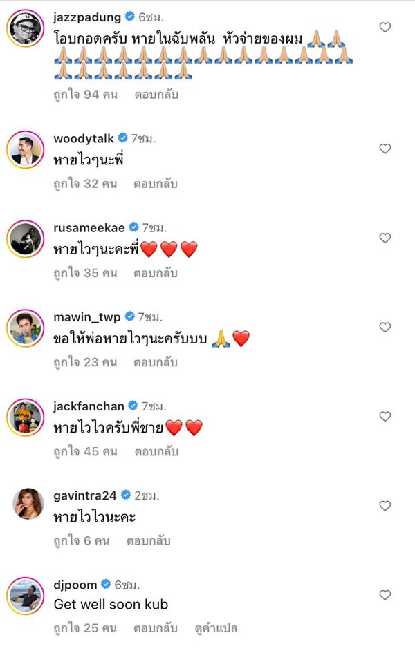 ทั้งนี้ ก็ได้มีแฟน ๆ พร้อมคนในวงการเข้ามาส่งกำลังใจ ขอให้หม่ำ จ๊กมก หายป่วยไว ๆ เช่นเดียวกับ โหน่ง ชะชะช่า ที่ได้โพสต์แจ้งข่าวผ่านอินสตาแกรมพร้อมอวยพรถึงหม่ำให้หายไว ๆ เช่นกัน