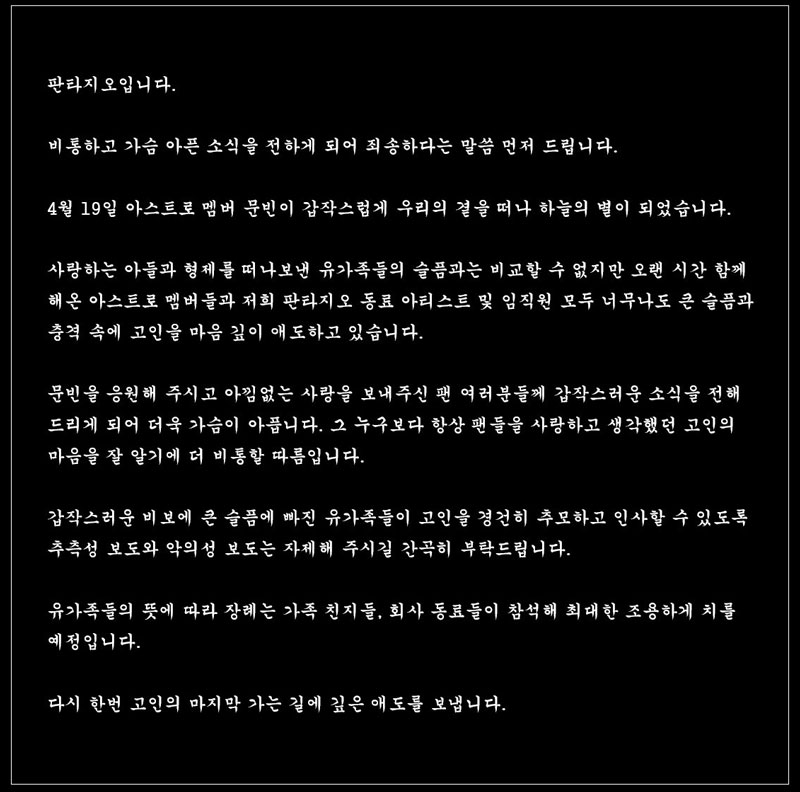 fantagio ต้นสังกัดของวง ASTRO ได้ยืนยันข่าวการเสียชีวิตของ มุนบิน แล้วว่าเป็นเรื่องจริง