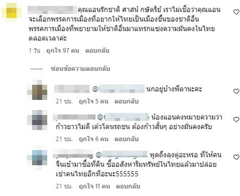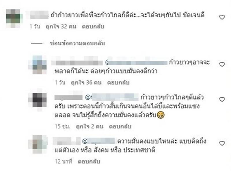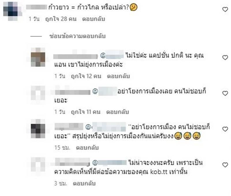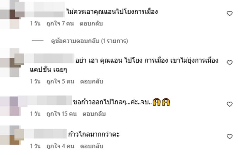 อาทิ อย่าโยงการเมืองเลย คนไม่ชอบก็เยอะ, ก้าวยาว ๆ อาจจะพลาดก็ได้นะ ค่อย ๆ ก้าวเเบบมั่นคงดีกว่า, ก้าวยาว ๆ ก้าวไกล ๆ ดีแล้วครับ เพราะตอนนี้ก้าวสั้นเกินจนคนอื่นไล่บี้และพร้อมแซงตลอด จนไม่รู้สึกถึงความมั่นคงแล้ว, ก้าวยาว = ก้าวไกล หรือเปล่า ?, แคปชั่นปกติ คุณแอนเขาไม่ยุ่งการเมืองค่ะ, ก้าว ๆ ยาว ๆ ไปพร้อมกันนะคะ, ก้าวยาว ๆ ไม่ดี เดี๋ยวโดนรถชน ควรก้าวสั้น ๆ อย่างมั่นคง และปลอดภัย ถูกต้องที่สุดครับ, ไม่ควรเอาคุณแอนไปโยงการเมือง ฯลฯ