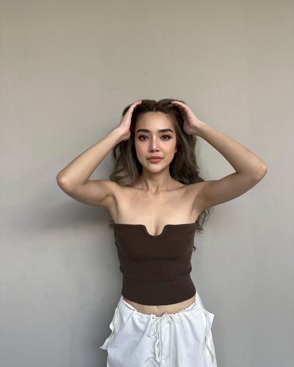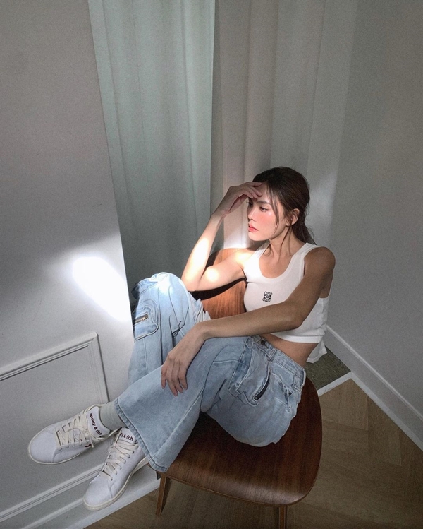 กางเกงคาร์โก้สีอ่อน แมตช์กับเสื้อกล้ามครอปสีขาว ดูสวยสบายตา