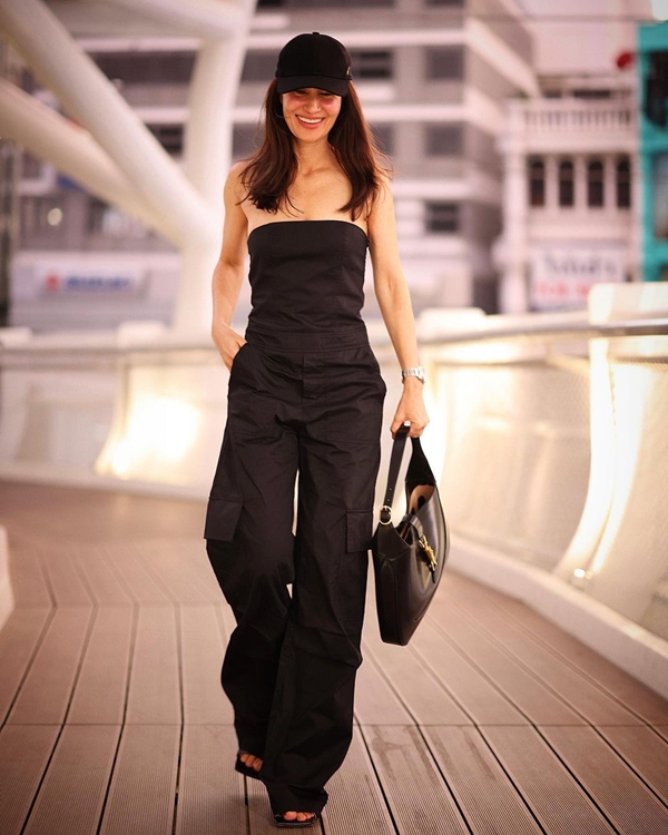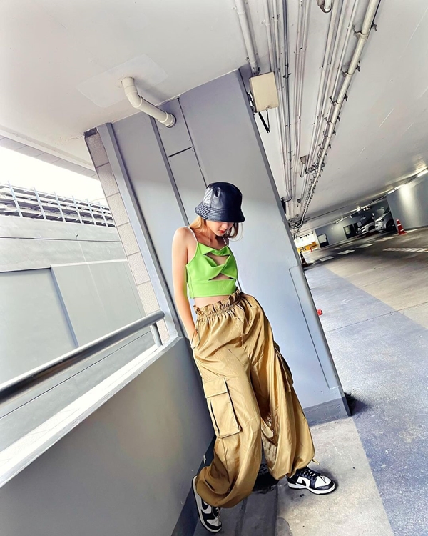 คุมโทนแคชชวลชิค ๆ ด้วยกางเกงคาร์โก้และเสื้อเกาะอกสีดำ พร้อมหมวกแก๊ป