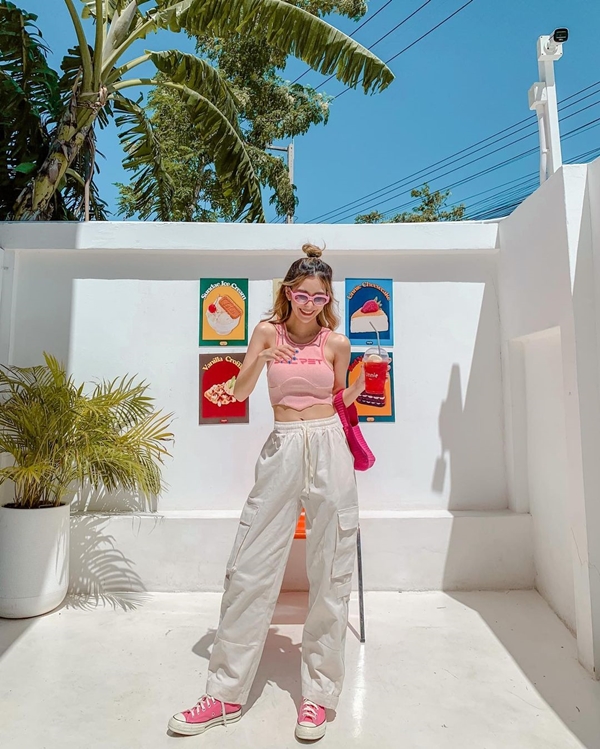 จับเสื้อกล้ามกับกางเกงคาร์โก้ในคู่สีนี้มาผสมกัน เพิ่มความสดใสแบบหวาน ๆ