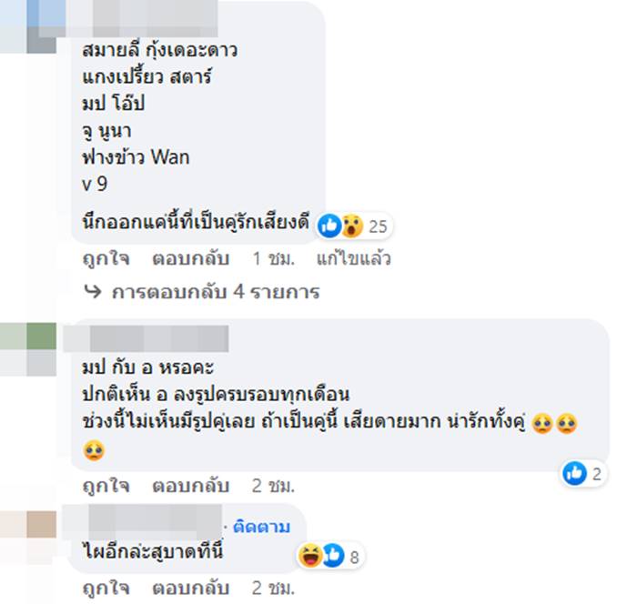 ขณะที่ชาวเน็ต ขาเมาท์ ขาเผือก ก็ต่างออกมารวมตัวรับบทเป็นสายสืบเพียบ พร้อมใบ้อักษรย่อกันระนาว อาทิ ดวงดาว กับแกงเปรี้ยว หรือหนูพุก กับเเบรนด์จูเนียร์, วีกับเก้าเหรอ, ข่าวเก่าชั้นยังไม่รู้ว่าใครเลย นี่ใบ้มาอีกแระ #ชั้นปวดหัวมากนะบอกเลย, ม้าปังกับเบบี้น้อยไหมนะ, โอบกับมะปรางค่ะ, คู่มะปรางป่ะ, มป-อ รึเปล่าคะ, ม + ต ไหมคะ, สมายลี่ กุ้งเดอะดาว แกงเปรี้ยว สตาร์ มป โอ๊ป จู นูนา ฟางข้าว Wan v 9, มป กับ อ หรอคะ ปกติเห็น อ ลงรูปครบรอบทุกเดือน ช่วงนี้ไม่เห็นมีรูปคู่เลย ถ้าเป็นคู่นี้ เสียดายมาก น่ารักทั้งคู่ ฯลฯ