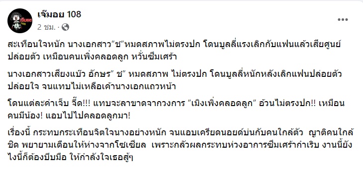 มีประเด็นข่าวซุบซิบดาราออกมาให้ได้ติดตามกันอีกครั้ง สำหรับเพจดัง เจ๊มอย 108 ที่ล่าสุด (18 พฤษภาคม 2566) ได้ออกมาโพสต์เรื่องราวของ นางเอกสาวเสียงแบ๊ว อักษรย่อ ช. ว่าเลิกกับแฟนแล้วเสียศูนย์ ปล่อยตัว จนโดนบูลลี่แรงว่าไม่ตรงปก ทำเอาคนรอบข้างเป็นห่วง และส่งกำลังใจให้รัว ๆ โดยข้อความทั้งหมดมีดังนี้