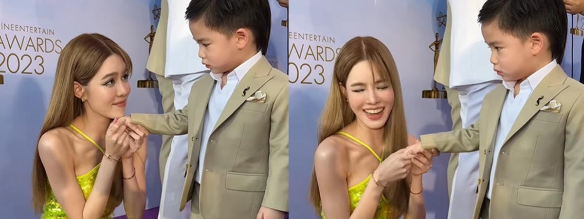 จนกระทั่งมาได้เห็นอีกหนึ่งมุมที่น่ารักของสาวเกรซแบบไม่เคยเห็นที่ไหนมาก่อน เมื่อเจ้าตัวได้มาเจอกับ น้องพีร์ ลูกชายฝาแฝดวัยกำลังโตของคุณพ่อบีม กวี และคุณแม่ออย อฏิพรณ์ ในงานเดินพรมม่วง ไนน์เอ็นเตอร์เทน อวอร์ด 2023 ที่ผ่านมา