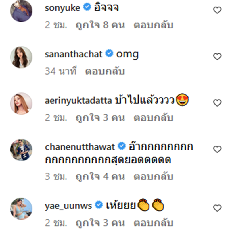 งานนี้เล่นเอาเพื่อน ๆ ดาราคนดังและแฟนคลับเข้ามาคอมเมนต์อิจฉากันรัว ๆ อาทิ เกรท วรินทร "อิจฉาแบบมาก ๆ ได้มั้ยยย", แอริน ยุกตะทัต "บ้าไปแล้วววว", นิกกี้ ณฉัตร "อยากเจอออบ้างงงงงงง", สน ยุกต์ "อิจจจ" ฯลฯ