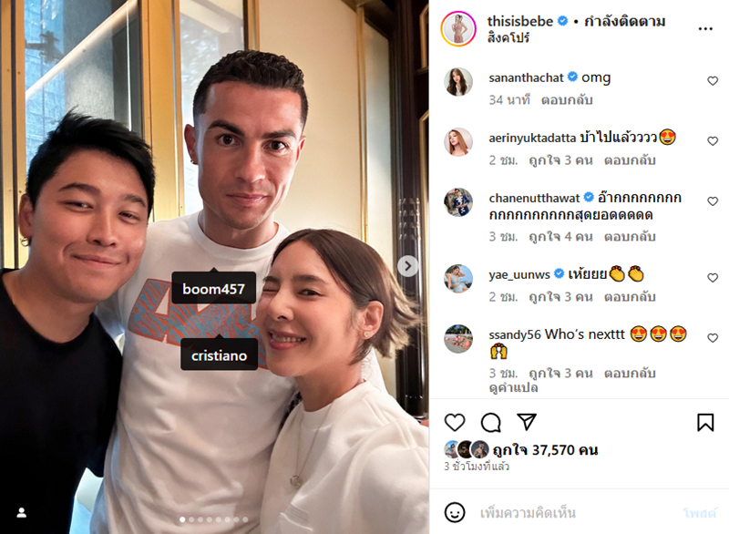 โดย เบเบ้ ได้ออกมาโพสต์ภาพเผยโมเมนต์สุดประทับใจนี้ผ่านอินสตาแกรมส่วนตัวเป็นภาพถ่ายร่วมเฟรมกับ คริสเตียโน่ โรนัลโด้ พร้อมกับแคปชั่นว่า "My life is now complete @cristiano" ที่บอกว่า ชีวิตของฉันคอมพลีตแล้ว แถมนักเตะดังยังเซ็นลายเซ็นบนเสื้อฟุตบอลให้ เบเบ้ เป็นของที่ระลึกด้วย