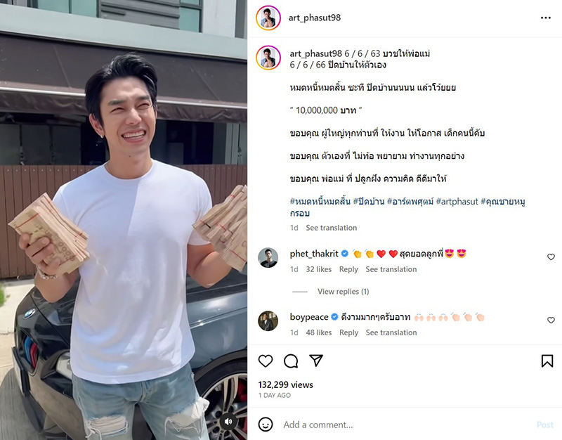 นอกจากนี้ อาร์ต ยังเขียนแคปชั่นเอาไว้ด้วยว่า "6 / 6 / 63 บวชให้พ่อแม่ 6 / 6 / 66 ปิดบ้านให้ตัวเอง หมดหนี้หมดสิ้น ซะที ปิดบ้านนนนน แล้วโว้ยยย 10,000,000 บาท ขอบคุณ ผู้ใหญ่ทุกท่านที่ให้งาน ให้โอกาสเด็กคนนี้ครับ ขอบคุณตัวเองที่ไม่ท้อ พยายามทำงานทุกอย่าง ขอบคุณพ่อแม่ที่ปลูกฝังความคิดดี ๆ มาให้ #หมดหนี้หมดสิ้น #ปิดบ้าน #อาร์ตพศุตม์ #artphasut #คุณชายหมูกรอบ"