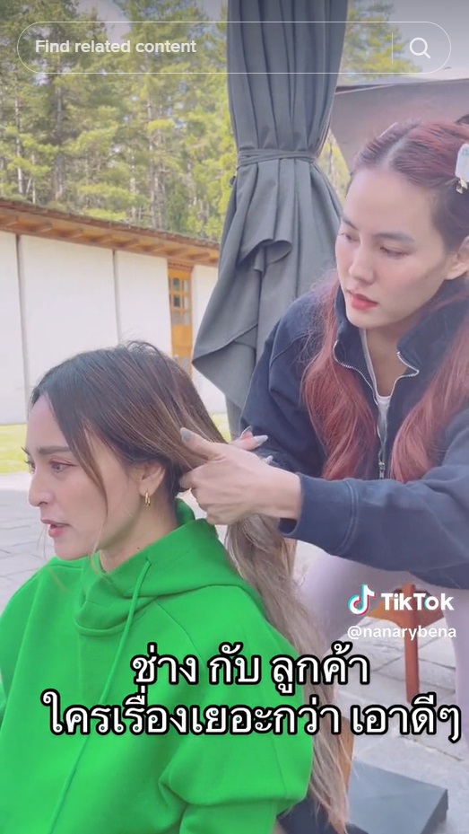 จากนั้นเจนี่ก็บอกนานาผมค่อนข้างหนา ซึ่งนานาก็บอกว่าเป็นเพราะกินงาดำ ผมเลยหนา ก่อนจะเร่งให้เจนี่รีบถัก โดยบอกว่าไม่ต้องปราณีตมากก็ได้ ถักเหมือนกลัวเจ็บ ดึงแรง ๆ ได้เลย ด้านเจนสุดาที่ถือกล้องดูเพื่อนสองคนมานาน ก็บอกนานาว่า "นี่ ! ขอแนะนำว่าอย่าบ่น อย่าบ่นเดี๋ยวจะโดนบ้อง" ทำเอาขำกันทั้ง 3 คน