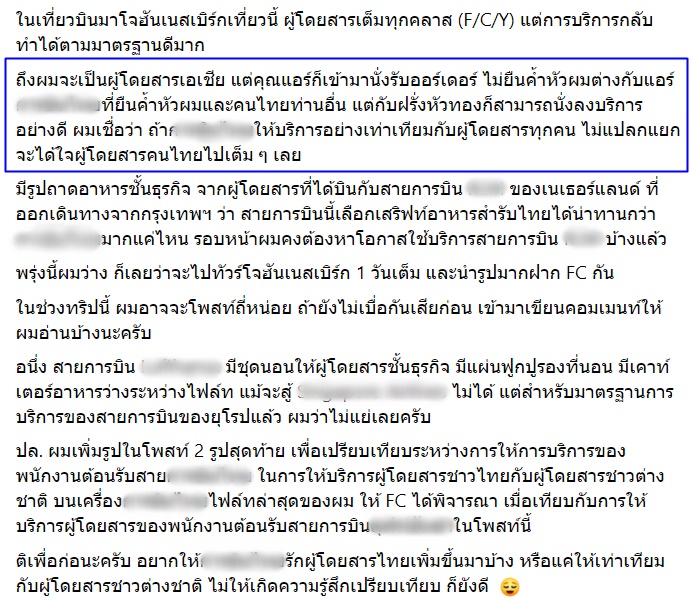 เป็นโพสต์ที่ถูกแชร์และพูดถึงไม่น้อย กรณีคุณหมอคนดัง โพสต์เกี่ยวกับสายการบินและการให้บริการ เทียบระหว่าง 2 สายการบิน บอกว่าสายการบินต่างชาติ แอร์เข้ามานั่งรับออร์เดอร์ ไม่ยืนค้ำหัว แม้ตนจะเป็นคนเอเชีย ต่างกับสายการบินของไทย ที่ยืนค้ำหัวตนและคนไทยคนอื่น แต่ถ้าเป็นฝรั่งจะนั่งบริการอย่างดี มองว่าเป็นการให้บริการไม่เท่าเทียม