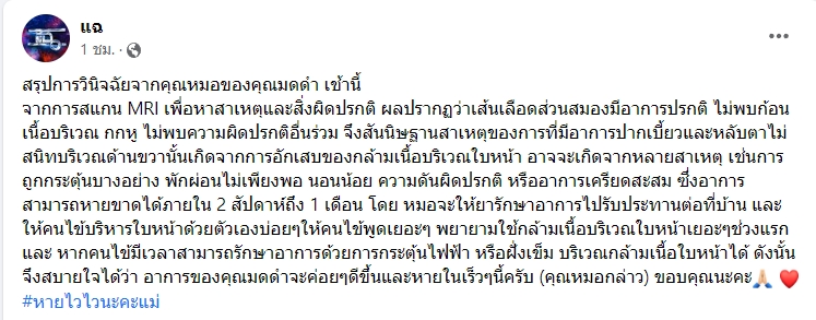 อาจจะเกิดจากหลายสาเหตุ เช่น การถูกกระตุ้นบางอย่าง พักผ่อนไม่เพียงพอ นอนน้อย ความดันผิดปกติ หรืออาการเครียดสะสม ซึ่งอาการสามารถหายขาดได้ภายใน 2 สัปดาห์ถึง 1 เดือน โดยหมอจะให้ยารักษาอาการไปรับประทานต่อที่บ้าน และให้คนไข้บริหารใบหน้าด้วยตัวเองบ่อย ๆ ให้คนไข้พูดเยอะ ๆ พยายามใช้กล้ามเนื้อบริเวณใบหน้าเยอะ ๆ ช่วงแรก และหากคนไข้มีเวลาสามารถรักษาอาการด้วยการกระตุ้นไฟฟ้า หรือฝั่งเข็ม บริเวณกล้ามเนื้อใบหน้าได้ ดังนั้นจึงสบายใจได้ว่า อาการของคุณมดดำจะค่อย ๆ ดีขึ้นและหายในเร็ว ๆ นี้ครับ (คุณหมอกล่าว) ขอบคุณนะคะ #หายไวไวนะคะแม่"