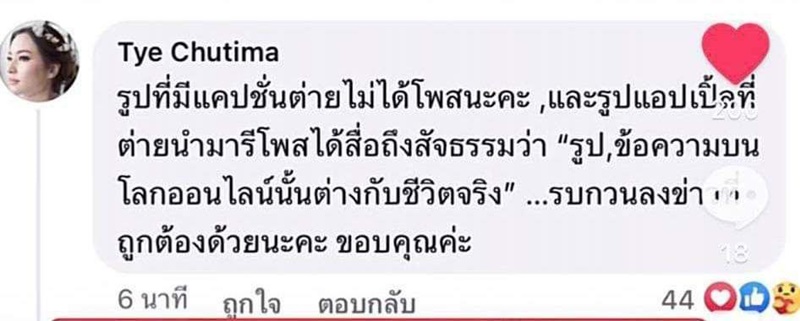 ทั้งนี้ ต่าย ชุติมา ได้ออกมาชี้แจงแล้วว่า โพสต์ที่เธอแชร์นั้นมีเพียงภาพ และข้อความ "ONLINE ISN'T REAL." ที่อยุ่ในภาพอยู่แล้วเท่านั้น ส่วนข้อความที่ระบุว่า "ไม่รู้ว่าจะสื่อถึงอะไร แต่ก็ดูพยายามดีนะคะ ลงแล้วลบ หนูงงเด้แม๊ ๆๆๆๆๆๆ" นั้นไม่ใช่ของเธอ ซึ่งคาดว่าข้อความที่เพิ่มมานั้นน่าจะเป็นของชาวเน็ตที่แสดงความคิดเห็นเกี่ยวกับโพสต์ดังกล่าวที่เธอลงแล้วลบไปนั่นเอง โดยระบุว่า "รูปที่มีแคปชั่นต่ายไม่ได้โพสต์นะคะ และรูปแอปเปิลที่ต่ายนำมารีโพสต์ได้สื่อถึงสัจธรรมว่า "รูป ข้อความบนโลกออนไลน์นั้นต่างกับชีวิตจริง" รบกวนลงข่าวที่ถูกต้องด้วยนะคะ ขอบคุณค่ะ"