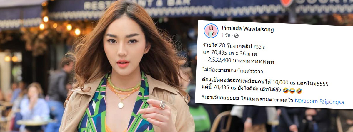 รายได้ 28 วันจากคลิป Reels แค่ 70,435 US x 36 บาท = 2,532,400 บาท เห็นรายได้แบบนี้ทำเอาเจ้าตัวถึงกับลั่นว่า "ไม่ต้องขายของกันแล้ววววว ต้องเปิดคอร์สสอนเหมือนคนได้ 10,000 US แตกไหม 5555"