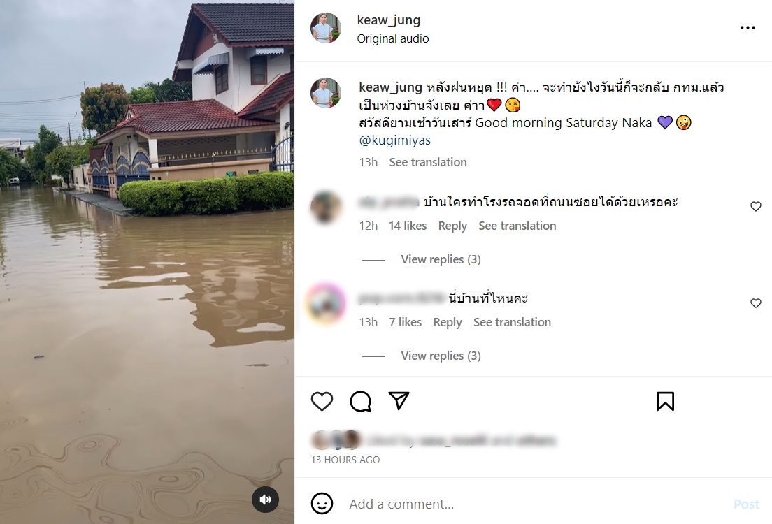 ทำเอาหลายคนเห็นแล้วอดเป็นห่วงไม่ได้ เมื่อเข้าไปใน IG ของ แม่แก้ว คุณแม่ของพระเอกสุดฮอต ณเดชน์ คูกิมิยะ แล้วพบว่าคุณแม่ได้โพสต์คลิปขณะลุยน้ำท่วมขังภายในหมู่บ้าน พร้อมข้อความว่า "หลังฝนหยุด !!! ค่า…. จะทำยังไงวันนี้ก็จะกลับ กทม. แล้ว เป็นห่วงบ้านจังเลยค่าา สวัสดียามเช้าวันเสาร์ Good morning Saturday Naka @kugimiyas"
