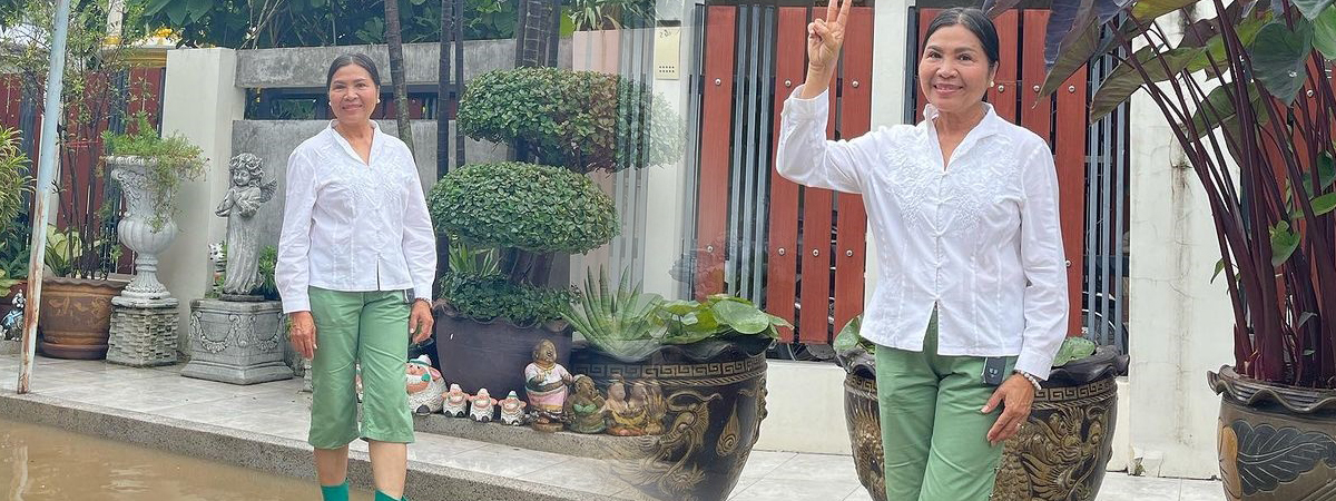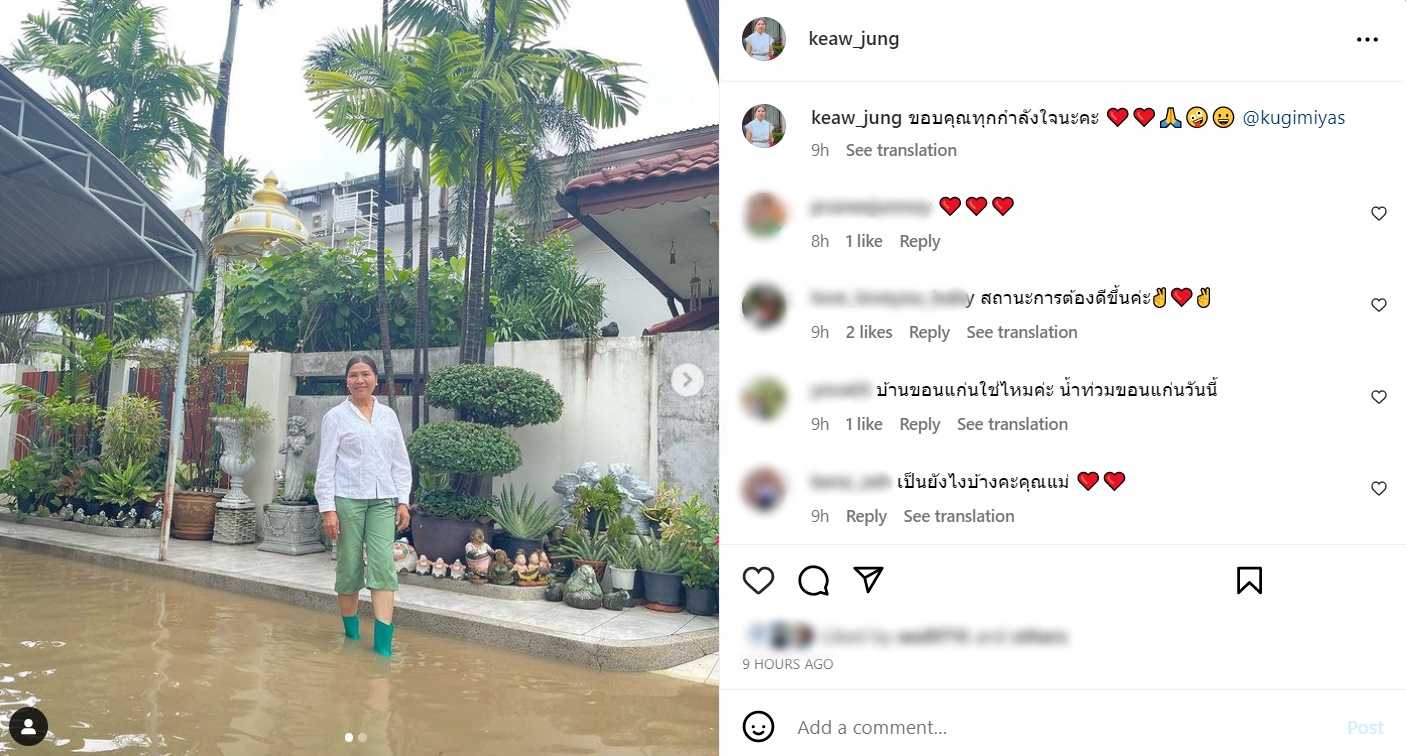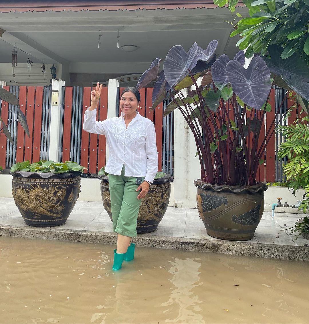 โดยหลังจากนั้นไม่นาน แม่แก้ว ก็ได้โพสต์ภาพขณะลุยน้ำท่วมขัง พร้อมข้อความ "ขอบคุณทุกกำลังใจนะคะ"