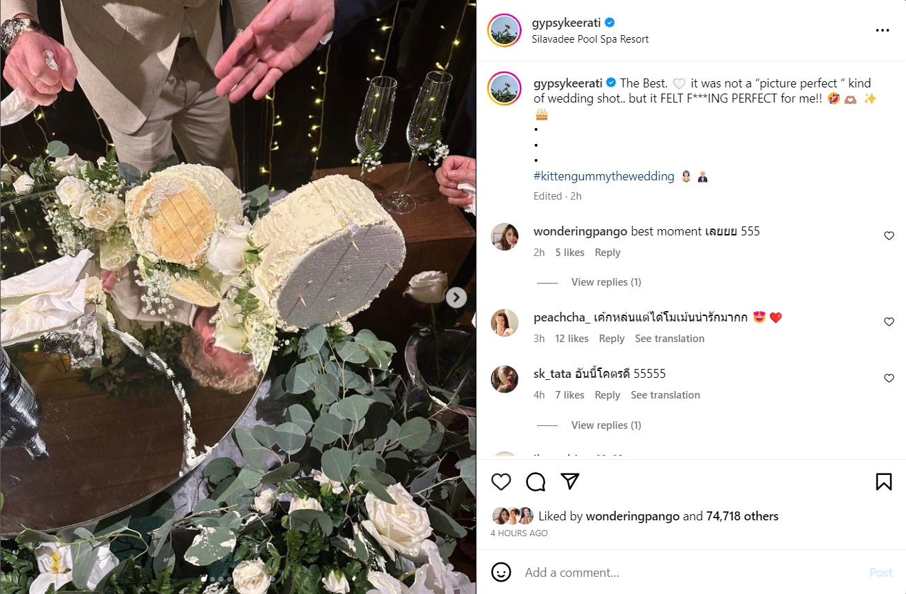 นอกจากนี้ ยิปซี ยังมีการเขียนแคปชั่นบรรยายโมเมนต์นี้ด้วยว่า "The Best. it was not a picture perfect kind of wedding shot.. but it FELT F***ING PERFECT for me !!" (ดีที่สุด มันอาจจะไม่ใช่ภาพถ่ายงานแต่งที่สมบูรณ์แบบที่สุด แต่มันเป็นความเฟลที่โคตรจะเพอร์เฟกต์สำหรับฉันเลย)