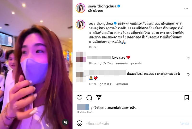 เซย่า ยังได้รุบะอีกว่า "ขอให้ทุกคนปลอดภัยนะคะ เซย่าบังเอิญมาพารากอนอยู่ในเหตุการณ์กราดยิง แต่ตอนนี้ปลอดภัยแล้วค่ะ เป็นเหตุการณ์ไม่คาดคิดที่น่ากลัวมาก ๆ ค่ะ ในตอนนั้นเซย่าใจหายมาก เพราะคนวิ่งหนีกันเยอะมาก ขอแสดงความเสียใจอย่างสุดซึ้งกับครอบครัวผู้เสียชีวิตและบาดเจ็บต่อเหตุการณ์ค่ะ"