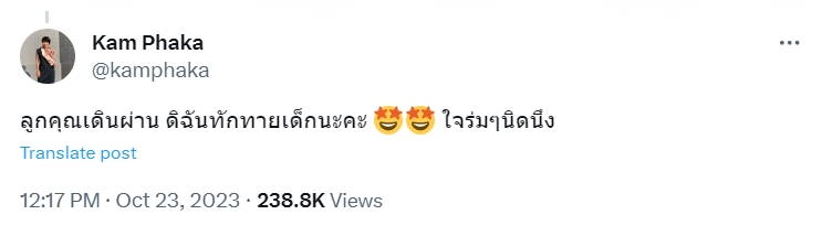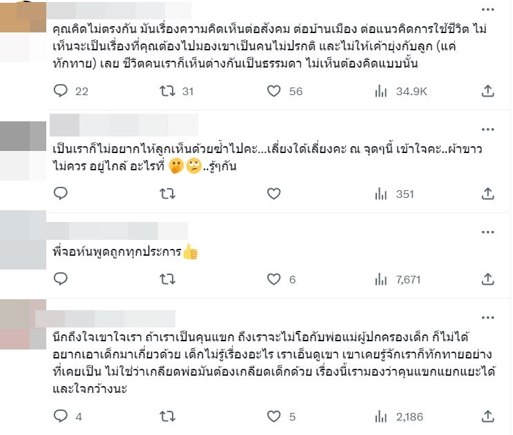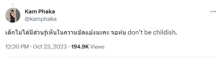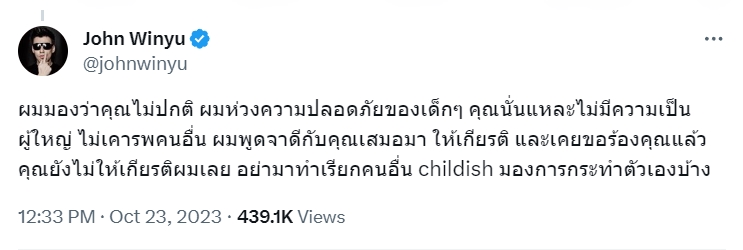 จากนั้นไม่นาน คำผกาก็บอกว่า ลูกของจอห์นเดินผ่าน ตนก็ทักทายเด็กธรรมดา แต่จอห์นก็มาตอบต่อว่า การทักทายลูกหลานคนที่ตัวเองด่า ต่อหน้าคนที่ตัวเองด่า ตนมองว่าคนทำอะไรแบบนี้ไม่ค่อยปกติ ความคิดไม่น่าปกติ ตนห่วงลูกกลัวคนไม่ปกติ ก่อนหน้านี้ก็มีการเรียกเด็ก ๆ เข้าบ้านตัวเอง คนเป็นพ่อย่อมกังวลความปลอดภัยในร่างกายและจิตใจของเด็ก แขกเองก็ต้องใจร่ม ๆ ไม่ใช่มาโวยวายทำตัวเป็นผู้ถูกกระทำ มีแต่คนไม่ปกติที่สนับสนุนพฤติกรรมแบบนี้