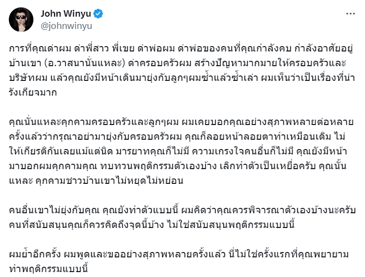 อย่างไรก็ตาม ทางจอห์น วิญญู ก็ได้มาโต้กลับเรื่องนี้อย่างดุเดือดเลือดพล่านว่า การที่แขกมาด่าตน ด่าพี่สาวของตน ด่าคุณพ่อของตน ซึ่งคุณพ่อของจอห์นก็คือพ่อของอาจารย์วาสนา คนที่แขกกำลังคบหาอยู่ ด่าครอบครัวจอห์น สร้างปัญหาให้ครอบครัวและบริษัทของจอห์น ยังมีหน้ามายุ่งกับลูกของตนซ้ำ ๆ และจอห์นคิดว่ามันเป็นเรื่องที่น่ารังเกียจ