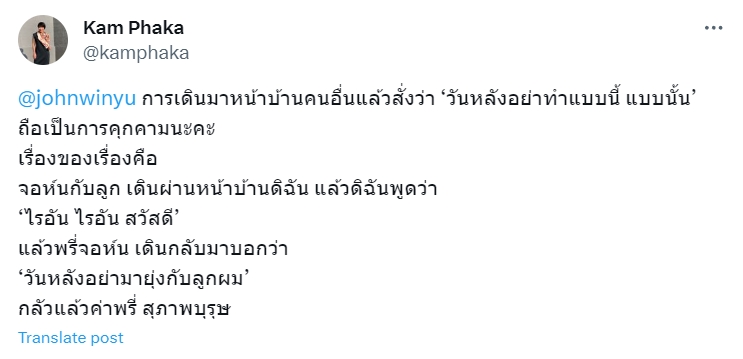 ทั้งนี้ แขก คำผกา ได้ทักทายน้องไรอันที่บ้านของจอห์น พูดว่า ไรอัน สวัสดี แต่จอห์นกลับเดินมาหาแขกที่บ้านของแขกและบอกว่า วันหลังอย่ามายุ่งกับลูกผม ทำให้แขกเกิดอาการไม่พอใจ และมองว่าสิ่งที่ทำนั้นคือการคุกคาม "กลัวแล้วค่าพรี่ สุภาพบุรุษ"