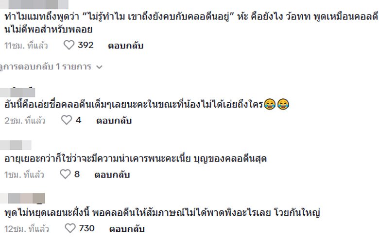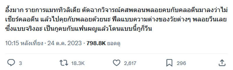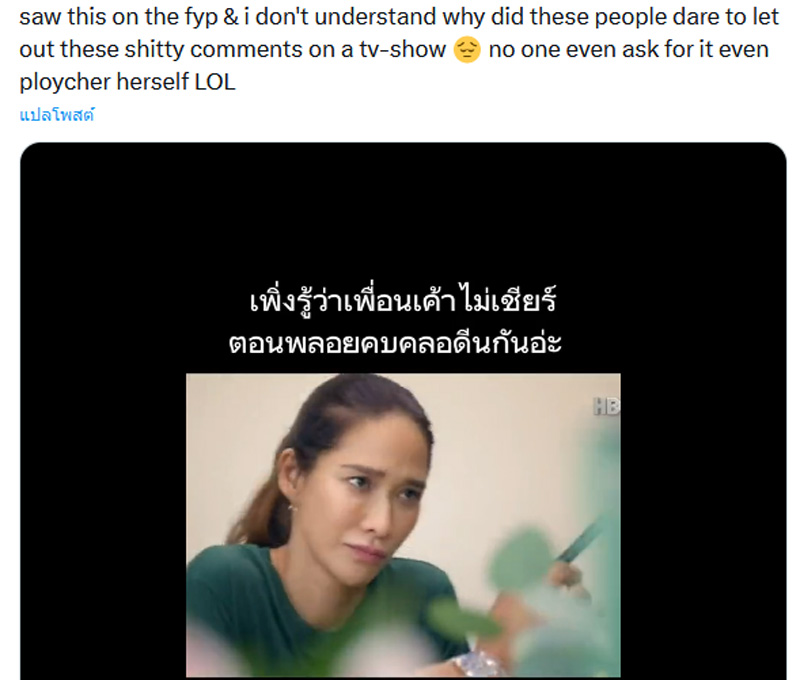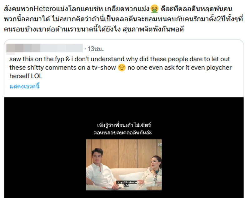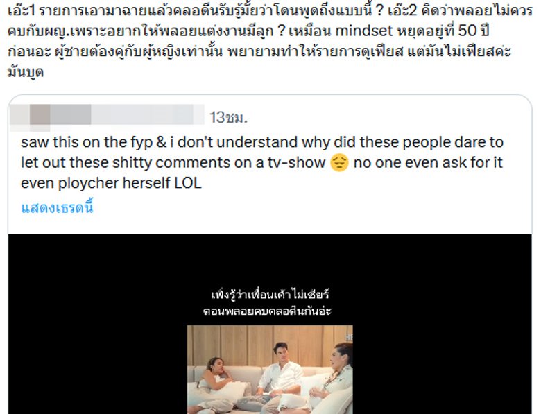 เอ๊ะ 1 รายการเอามาฉายแล้วคลอดีนรับรู้ไหมว่าโดนพูดถึงแบบนี้ ? เอ๊ะ 2 คิดว่าพลอยไม่ควรคบกับผู้หญิงเพราะอยากให้พลอยแต่งงานมีลูก ? เหมือน mindset หยุดอยู่ที่ 50 ปีก่อนอะ ผู้ชายต้องคู่กับผู้หญิงเท่านั้น พยายามทำให้รายการดูเฟียร์ซ แต่มันไม่เฟียร์ซค่ะ มันบูด
