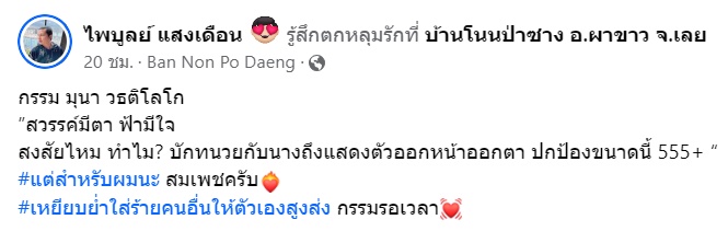มีประเด็นออกมาให้ได้จับตากันอีกครั้ง เมื่อล่าสุด (3 พฤศจิกายน 2566) ครูไพบูลย์ แสงเดือน ได้ออกมาโพสต์สเตตัสเหมือนจะฉะใคร บอกว่า "กรรม มุนา วธติโลโก สวรรค์มีตา ฟ้ามีใจ สงสัยไหม ทำไม ? บักทนวยกับนางถึงแสดงตัวออกหน้าออกตา ปกป้องขนาดนี้ 555+ #แต่สำหรับผมนะ สมเพชครับ #เหยียบย่ำใส่ร้ายคนอื่นให้ตัวเองสูงส่ง กรรมรอเวลา"