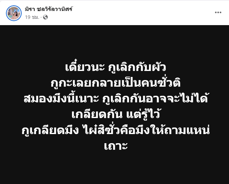 ทั้งนี้เมื่อไปส่องความเคลื่อนไหวของ เอ๋ มิรา อดีตภรรยา ที่มีประเด็นดราม่ากันมาก่อน ก็พบว่ามีการขึ้นสเตตัส หลังจากโพสต์ของครูไพบูลย์ราว 1 ชม. ระบุว่า "เดี๋ยวนะ กูเลิกกับผัว กูกะเลยกลายเป็นคนซั่วติ สมองมึงนี้เนาะ กูเลิกกันอาจจะไม่ได้เกลียดกัน แต่รู้ไว้ กูเกลียดมึง ไผ๋สิซั่วคือมึงให้ถามแหน่เถาะ"
