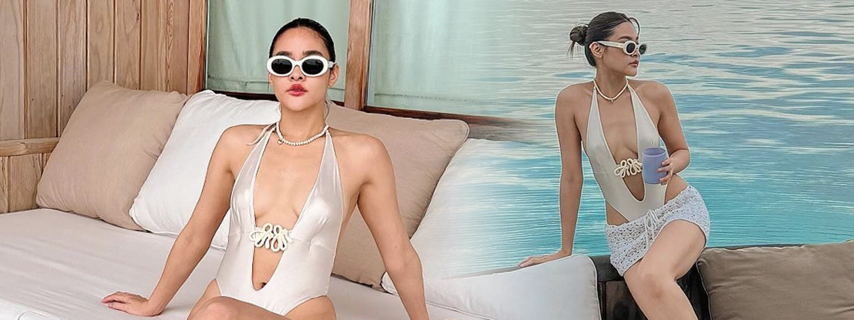โดยเฉพาะภาพความแซ่บของสาวปุ๊กลุก ในชุดว่ยน้ำวันพีชสีเงินที่เซ็กซี่ทะลุปรอทแหวกหน้าลึกถึงสะดือ และเว้าขาสูงปรี๊ด อวดทั้งอกอึ๋ม และบั้นท้ายงอนงามเต็มตา เล่นเอาทะเลมัลดีฟส์ร้อนฉ่าขึ้นมาทันที