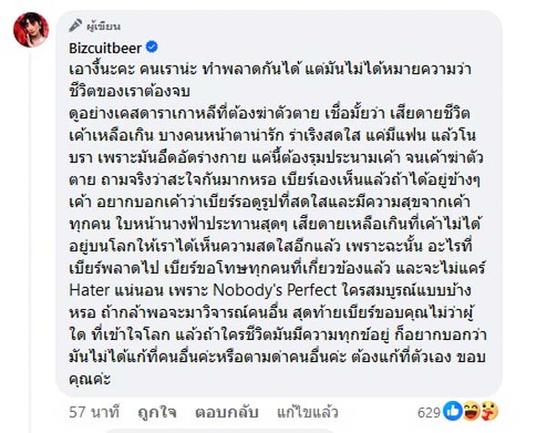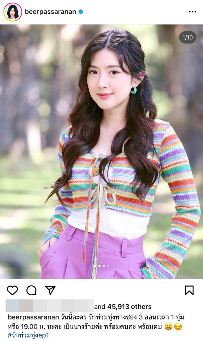 แต่ก็ไม่วายมีคอมเมนต์แซะว่า "บทคล้ายกับชีวิตจริงเลยครับ" ซึ่งเบียร์ก็ตอบกลับว่า "ไม่เหมือนค่ะ ชีวิตจริงเค้ามาชอบเราเองนะ... ในเรื่องต้องทำทุกอย่าง ทำแกง ทำสารพัด ถ้ามีเวลาก็รอชมค่ะ" ทำเอาชาวเน็ตหลายคนกดถูกใจ มองว่า เบียร์ไม่เคยตายไมค์ ครั้งนี้ตอบได้ดี และยังขายละครไปด้วย