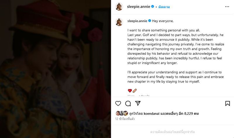 แต่ล่าสุด (8 กุมภาพันธ์ 2567) สาวแอนนี่ ก็ออกมาโพสต์ร่าวยาวเปิดเรื่องสุดช็อกประกาศเลิกหนุ่มกอล์ฟกลางอินสตาแกรมส่วนตัว พร้อมชี้แจงว่าความจริงทั้งคู่เลิกกันตั้งแต่ปีที่แล้ว แต่ฝ่ายชายไม่อยากให้บอกเรื่องนี้ แต่เธอไม่อยากเป็นคนโง่อีกต่อไป จึงออกมาพูดเรื่องนี้ด้วยตัวเอง
