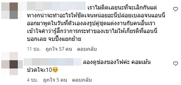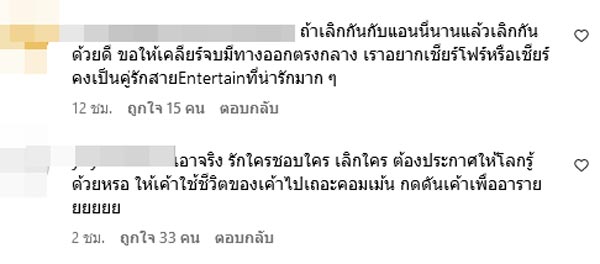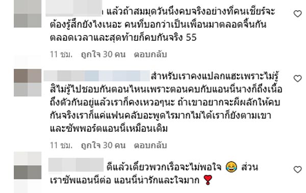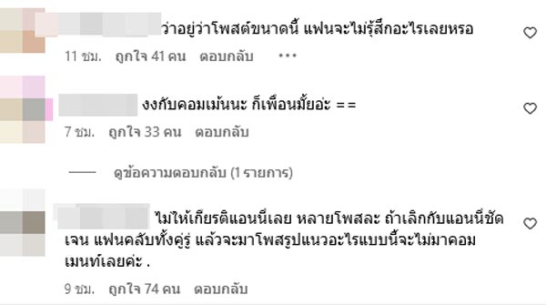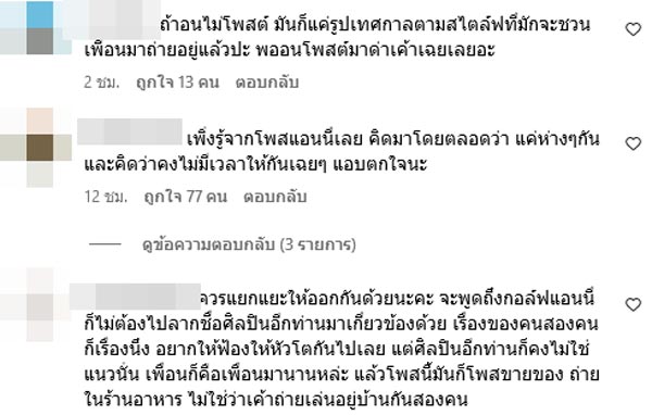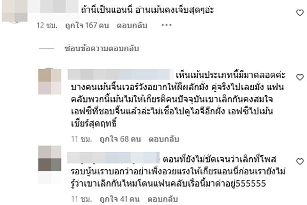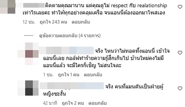 อาทิ ติดตามคุณมานาน แต่คุณดูไม่ respect กับ relationship เท่าไรเลยคะ ทำให้ทุกอย่างคลุมเครือ จนแอนนี่ต้องออกมาโพสต์เอง, ถ้านี่เป็นแอนนี่ อ่านเมนต์คงเจ็บสุด ๆ อะ, ทำไมถึงปล่อยผ่านมานาน จนทำให้ฝ่ายหญิงออกมาบอกเองว่าแยกทางกันแล้ว, จริง ไหนว่าไม่ทอดทิ้งแอนนี่ เข้าใจแอนนี่เลย กอล์ฟทำร้ายความรู้สึกเกินไป บ้านใหม่คงไม่มีแอนนี่แล้ว จะมีใครก็เชิญ ไม่สนใจละ, เห็นเมนต์ประเภทนี้มีมาตลอดค่ะ บางคนเมนต์จิ้นเว่อร์วังอยากให้ผีผลักมั่ง คู่จริงไปเลยมั่ง แฟนคลับพวกนี้เมนต์ไม่ให้เกียรติคนปัจจุบัน เขาเลิกกันคงสมใจเอฟซีที่ชอบจิ้นแล้วล่ะไม่เชื่อไปดูไอจีอีกฝั่ง เอฟซีไปเมนต์เชียร์สุดฤทธิ์, ตอนที่ยังไม่ชัดเจนว่าเลิกที่โพสต์รอบนู้นเราบอกว่าอย่าเพิ่งอวยแรงให้เกียรติแอนนี่ก่อนเรายังไม่รู้ว่าเขาเลิกกันไหมโดนแฟนคลับเรือนี้มาด่าอยู่ 555555, แล้วถ้าสมมติวันหนึ่งคบจริงอย่างที่คนเชียร์จะต้องรู้สึกยังไงเนอะ คนที่บอกว่าเป็นเพื่อนมาตลอดจิ้นกันตลอดเวลาและสุดท้ายก็คบกันจริง 55, ถ้าแอนนี่ไม่โพสต์ มันก็แค่รูปเทศกาลตามสไตล์ฟที่มักจะชวนเพื่อนมาถ่ายอยู่แล้วปะ พอแอนนี่โพสต์มาด่าเค้าเฉยเลยอะ, ไม่ให้เกียรติแอนนี่เลย หลายโพสต์ละ ถ้าเลิกกับแอนนี่ชัดเจน แฟนคลับทั้งคู่รู้ แล้วจะมาโพสต์รูปแนวอะไรแบบนี้จะไม่มาคอมเมนต์เลยค่ะ ฯลฯ