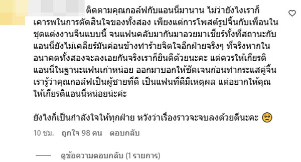 งานนี้ก็มีทั้งแฟน ๆ ที่เข้ามาคอมเมนต์จิ้นทั้งคู่และบอกว่าเหมาะสมกันแอบเชียร์ ๆ แต่ก็มีอีกด้านที่เข้ามาคอมเมนต์ติงเชิงว่า หนุ่มกอล์ฟ ไม่ให้เกียรติอดีตแฟนสาวเลย ถ้า แอนนี่ เข้ามาเห็นคงรู้สึกเจ็บกับความสัมพันธ์ที่คลุมเครือ ไม่แปลกใจที่ฝ่ายหญิงจะทนไม่ไหวจนต้องออกมาโพสต์ประกาศเลิกเอง