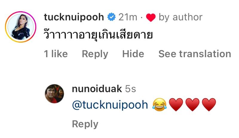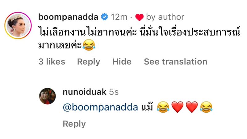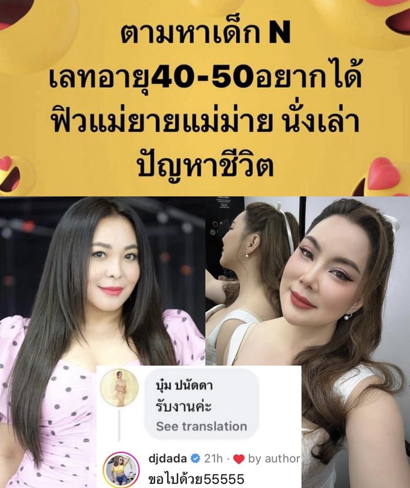 งานนี้แม่บุ๋มเลยไม่รอช้า เข้าไปคอมเมนต์ว่า "รับงานค่ะ" เท่านั้นยังไม่พอเพราะ ดีเจดาด้า วรินดา พิธีกรดังที่หลายคนจดจำได้ในบท เจ๊แวว แม่เล้าในเรื่อง หลงไฟ ยังเข้ามาคอมเมนต์ต่อของแม่ด้วยว่า "ขอไปด้วย 55555" ด้าย ตั๊ก ศิริพร ก็คอมเมนต์ด้วยว่า "ว้าาาาา อายุเกินเสียดาย"