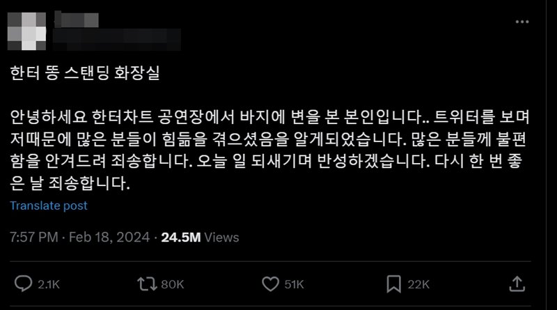 "สวัสดี ฉันเป็นคนที่อุจจาระใส่กางเกงตรงหน้าเวทีในงาน HMA ฉันรู้ว่ามีหลายคนต้องทนทุกข์เพราะฉัน หลังจากฉันได้เห็นทาง Twitter ฉันขอโทษที่ทำให้หลายคนรู้สึกแย่ ฉันจะจำเหตุการณ์วันนี้ และจะพิจารณาตัวเอง ฉันขอโทษอีกครั้ง สำหรับการทำลายวันดี ๆ ของพวกคุณ"
