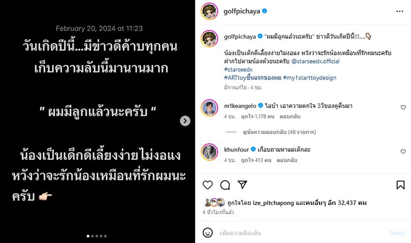 เล่นเอาแฟนคลับตกใจไปตาม ๆ กัน สำหรับนักร้องนักแสดงหนุ่ม กอล์ฟ พิชญะ ที่ล่าสุด (20 กุมภาพันธ์ 2567) ได้ออกมาโพสต์ประกาศว่า มีลูกแล้ว ฉลองวันเกิดอายุ 37 ปี เล่นเอาเซอร์ไพรส์ไปตาม ๆ กัน พร้อมสงสัยว่าเจ้าตัวไปมีลูกตอนไหน