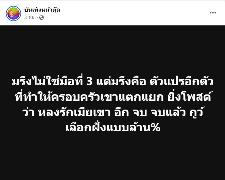 - มรึงไม่ใช่มือที่สาม แต่มรึงคือ ตัวแปรอีกตัวที่ทำให้ครอบครัวเขาแตกแยก ยิ่งโพสต์ว่า หลงรักเมียเขา อีก จบ จบแล้ว กูว์เลือกฝั่งแบบล้าน %